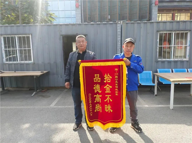10月7日,一名乘客帶著寫有“拾金不昧 品德高尚”的錦旗來(lái)到211.222路車隊(duì),以此表達(dá)對(duì)駕駛員彭軍的感激之情。